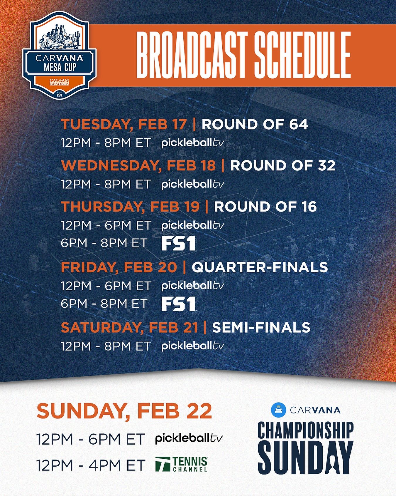 Coverage for the Mesa Cup will be broadcast on pickleballTV (now available on YouTube TV), with side court streaming on YouTube. Broadcast moves to FS1 on Friday 6-8 p.m. and catch Championship Sunday on Tennis Channel from 12-4 p.m.