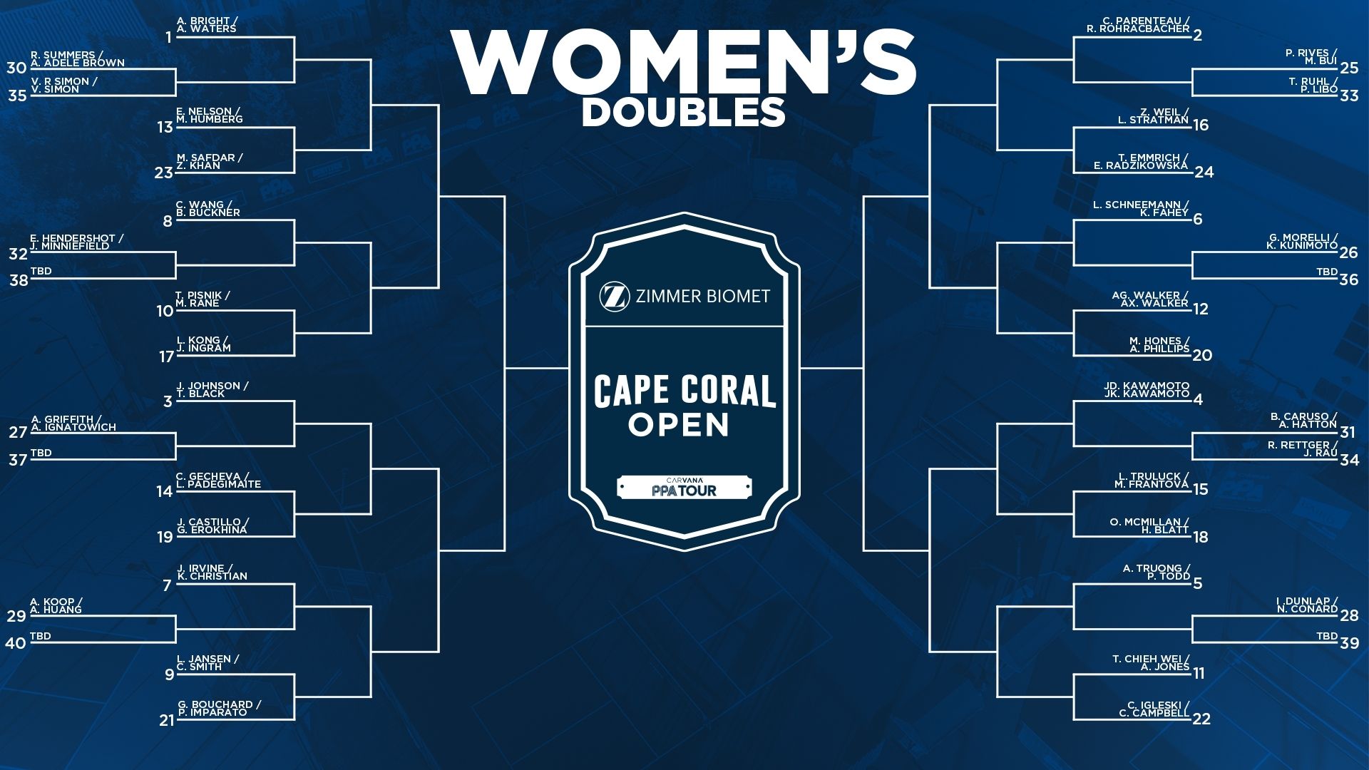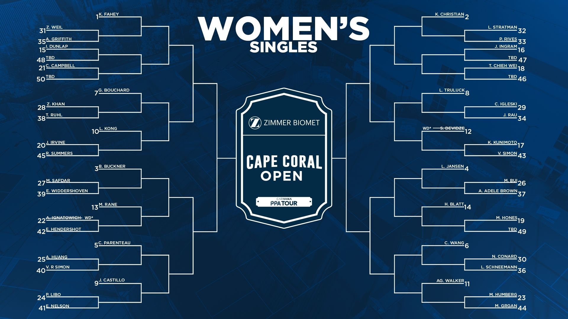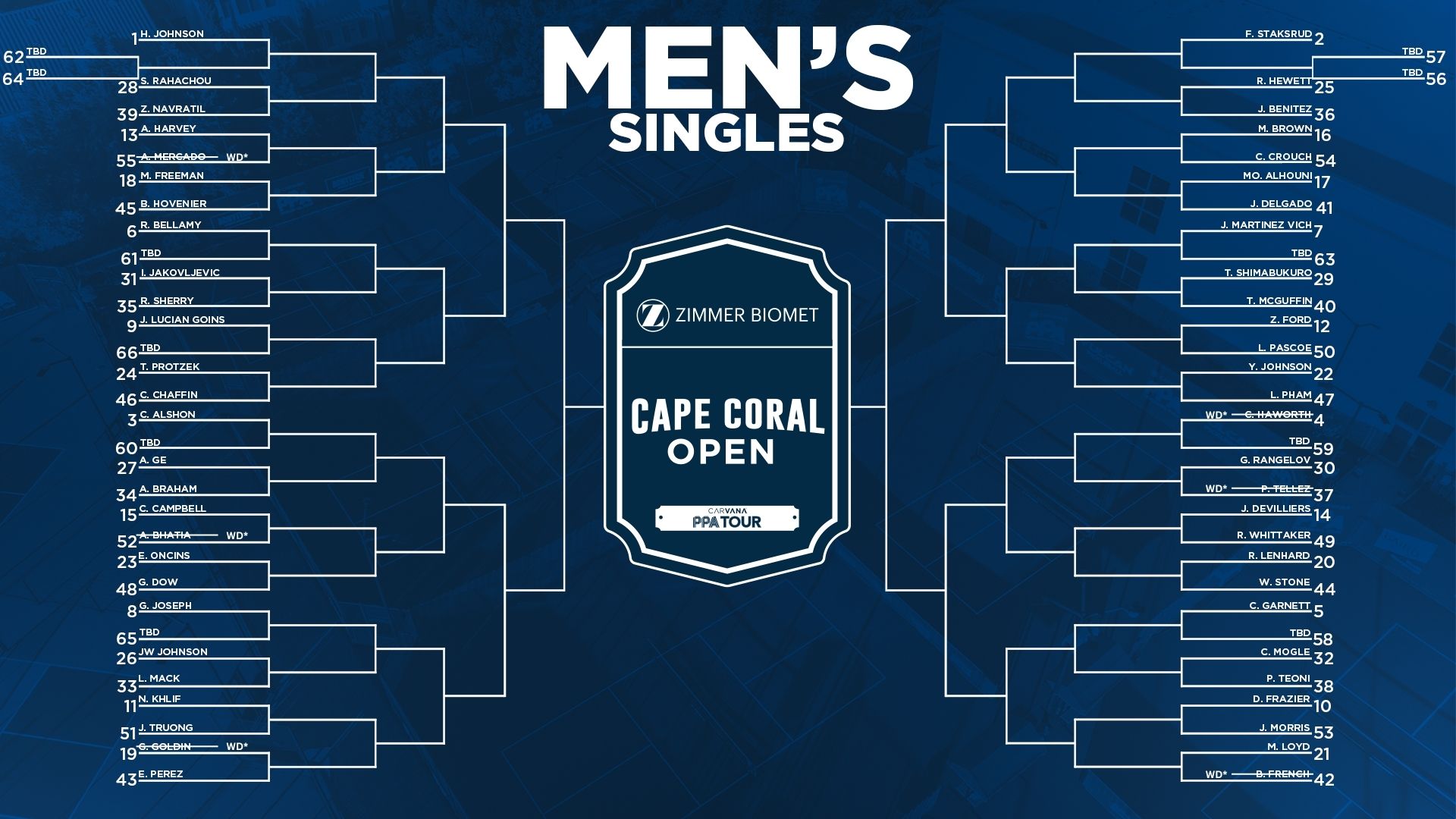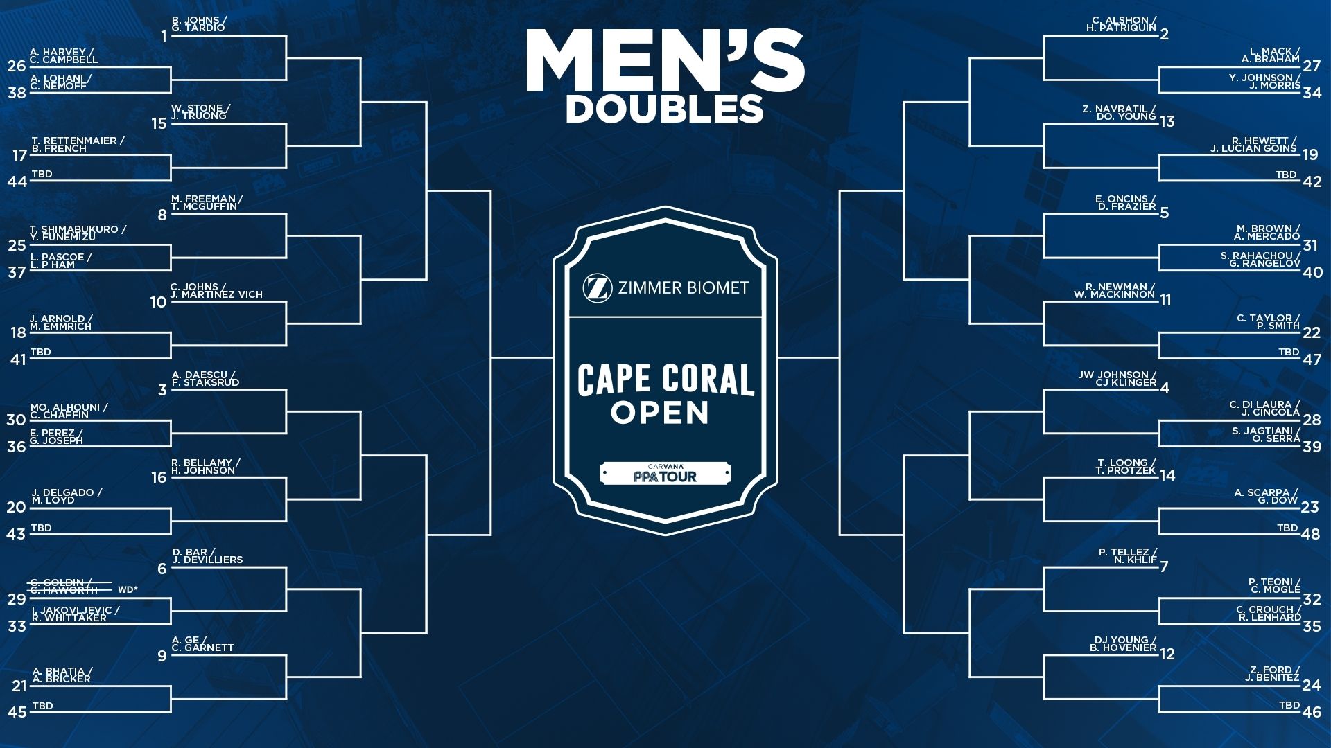 Withrawals: Grayson Goldin, Pablo Tellez, Chris Haworth, and Brandon French all withdrew before the bracket began. Only Haworth (#4) and Goldin (#19) were replaced with qualifier players.