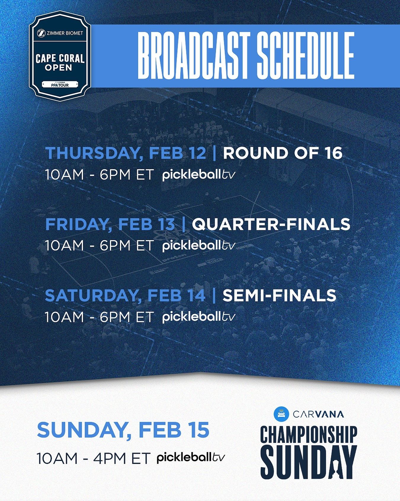Coverage for the Cape Coral Open will be broadcast on PickleballTV (now available on YouTube TV), with side court streaming on YouTube. Coverage begins daily at 10 a.m. ET.